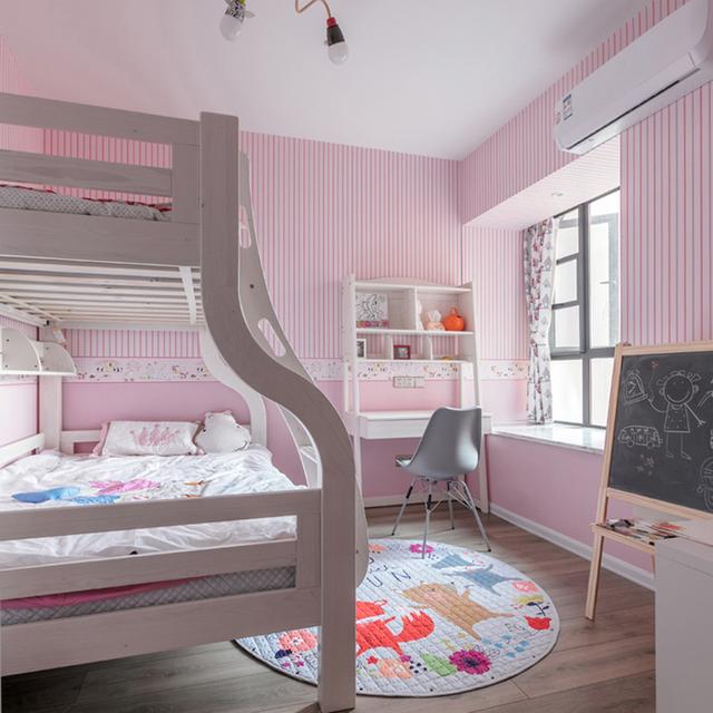 儿童房设计装修的十分文艺有情调,在墙壁上采用了这种浅粉色的扣板装饰,搭配浅色的实木地板装饰,使得卧室显得更加文艺有情调。在卧室还摆放了一张精致的上下床,搭配舒适的被褥,能够轻松容纳两个孩子居住休息,将室内的空间充分的使用起来。