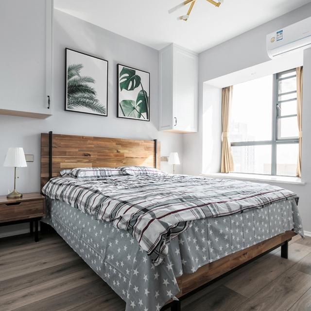卧室墙壁上采用了时下非常流行的高级灰色,在床头还安装了精美的吊柜,使得卧室显得非常时尚有立体感,同时也能提供相当好的储物空间,能够轻松收纳一些小件物品。浅色的实木大床非常精致宽敞,搭配舒适的被褥,能够营造出一种温馨舒适的休息环境,躺在大床上透过窗户也能看到外面美丽的景色,从而让人从心里感觉更加惬意舒适。