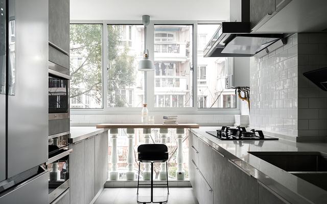 厨房以高级灰色为主色,在厨房还打造了一面大尺寸的落地窗,使得厨房有着更好的视野和采光效果,日常做饭更加轻松。橱柜靠两边墙壁安装,灰色的橱柜非常精致,将电器很好的镶嵌在其中,同时也能提供非常好的储物空间,将厨具整齐的收纳起来。