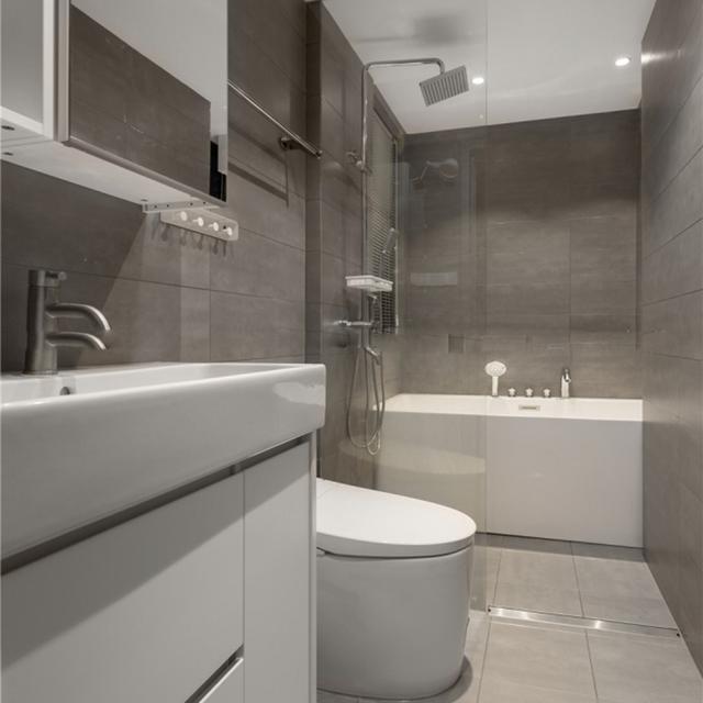 卫生间空间布局非常科学合理,还使用玻璃墙将淋浴与马桶之间隔开,既不影响室内的空间感,同时也能很好的保持室内干爽,防止卫生间因为潮湿而产生异味。白色的浴室柜非常精致,能够将洗浴用品整齐的收纳起来。