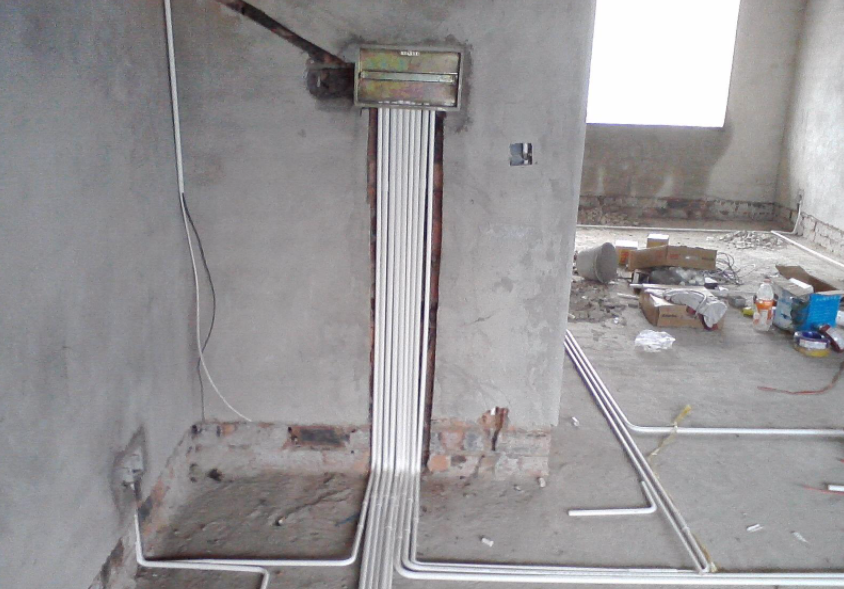 2、水电位置确定后,在垂直面根据横平竖直的原则,放线,开槽,布水管和线管,水平面的可以最近两点直接连接;