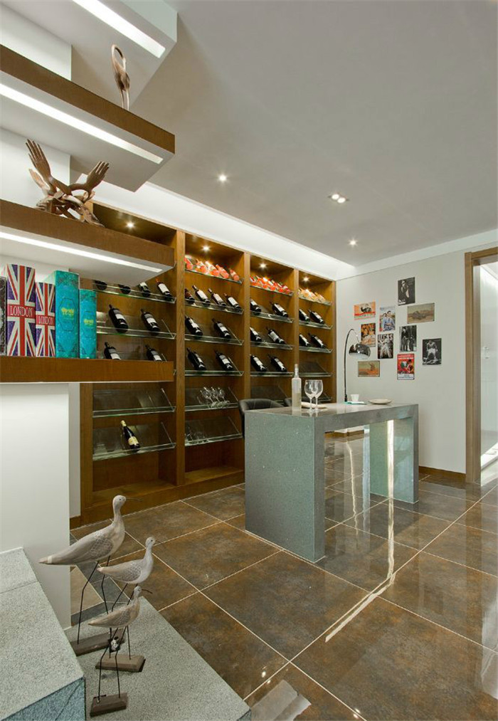 沙发比较比较简洁大气,背景直接用墙纸和饰面板上墙的,边上的柜子也设计的非常有特色。餐厅的面积也是非常大的,业主家的餐桌就是现场用石英石做出来的,很上档次,也可以作为吧台使用。