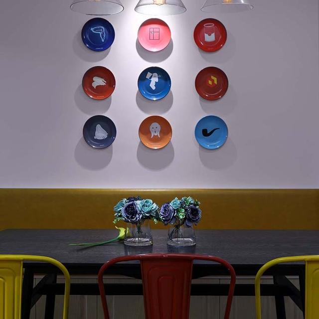 餐厅背景墙上采用了蓝灰色的格调,下半部分采用浅色的实木扣板装饰,能够让餐厅显得更加时尚有层次感。在餐厅背景墙上还安装了一组碟型的装饰品,在灯光的映衬下,能够让餐厅显得更加文艺有格调感。在餐厅还安装了一个宽敞的卡座,搭配几把亮色的椅子,既温馨又让餐厅显得更加年轻有活力。