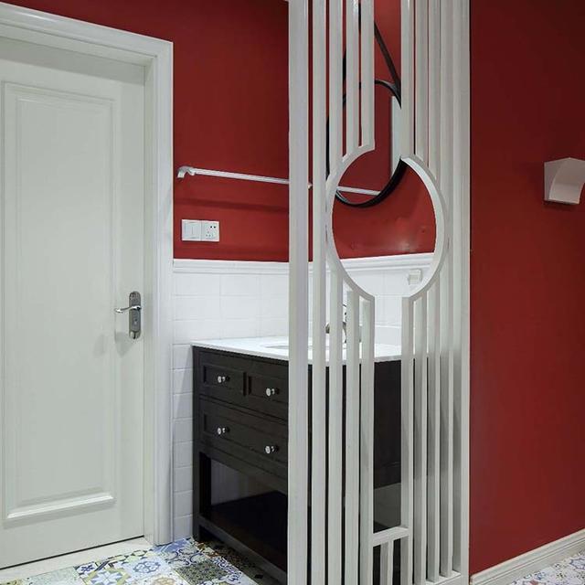 浴室柜放在了卫生间的外面,浴室柜本身非常精致,周围还采用白色的瓷砖装饰,使得这里显得更加文艺漂亮,同时也能起到很好的防潮效果,日常打理起来也更加便利。浴室柜所在墙壁上采用砖红色的格调,选择颜色十分大胆,把室内映衬的十分浪漫温馨。