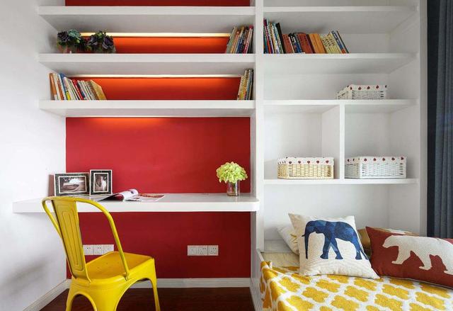 次卧的面积比较小,采用榻榻米的装修方案,这种一体化的设计能够为卧室节省不少的空间,让卧室显得更加敞亮大气,能够让人得到非常好的休息。白色的榻榻米非常精致,与砖红色的背景墙形成了鲜明的对比,显得格调感十足,能够在隔板上摆放一些书籍与装饰品,从而让卧室显得更加文艺有立体感。