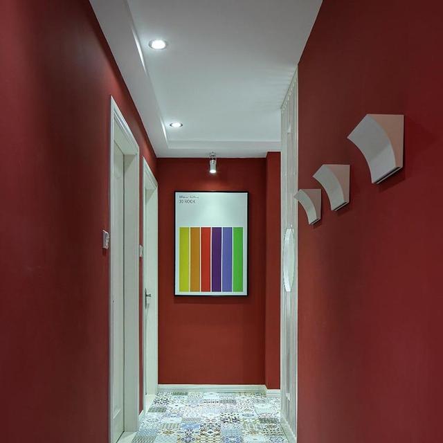 走廊墙壁上采用了这种砖红色的格调,与白色的屋顶很好的搭配在了一起,能够让室内显得更加文艺有层次感,在走廊墙壁上还安装了白色的艺术品,能够让走廊显得更加文艺有立体感。为了让室内显得更加丰富多彩,还在墙壁上装饰了一幅大尺寸的壁画,多彩的壁画能够为室内增添更多的清新与活力。
