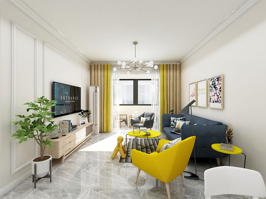 原木色和白色占几乎是北欧风的主打色,客厅却采用蓝色、黄色、灰色等多种色彩来点缀,温馨浪漫的北欧风格家就这样被从容塑造出来了。