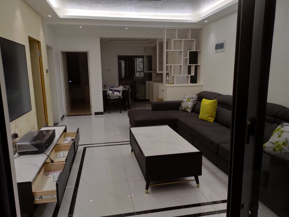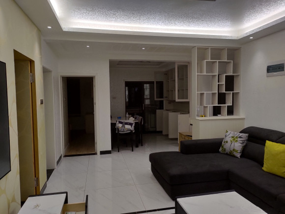 客厅也就简单的装修,做了个回字形的石膏板吊顶,有装了灯带,好在灯带的颜色不土。沙发看起来是没有档次的,但这个沙发很耐脏,我要的就是耐脏,要不然小孩子一下搞脏了。