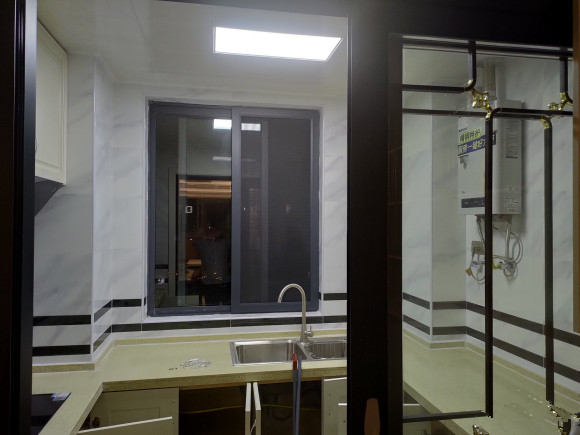 厨房不大,装的是燃气热水器,吊柜就做一边的,高度也不够,吊柜也不高,凑合用吧!