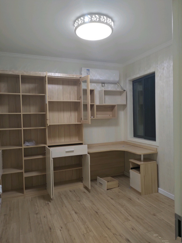 这个柜子是叫木工打的,连着桌子一起做了柜子,相当于一体柜了。