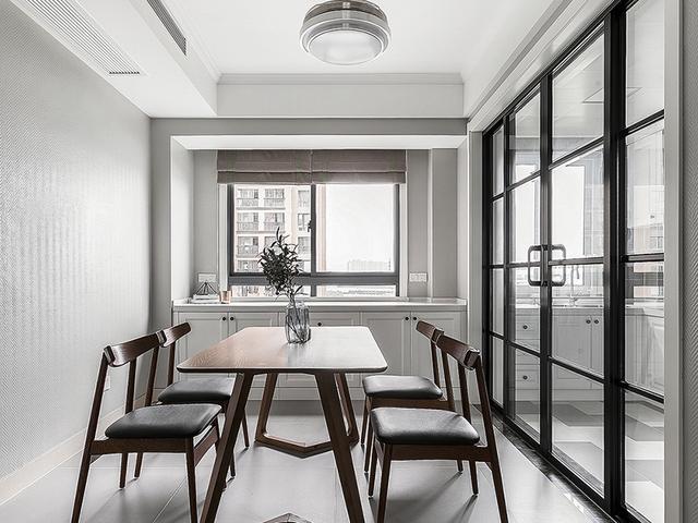 客厅的沙发背景墙,直接刷成比较素雅的草绿色,这种绿色也太正点了,看到这样一面墙壁很是缓解视觉疲劳。餐厅空间比较宽敞,靠窗的地方为了利用空间,打造了一排的橱柜,可以实现储物收纳,搭配复古的实木餐桌椅,在这样的空间用餐也是很简约小资,给人一种岁月静好的感觉。