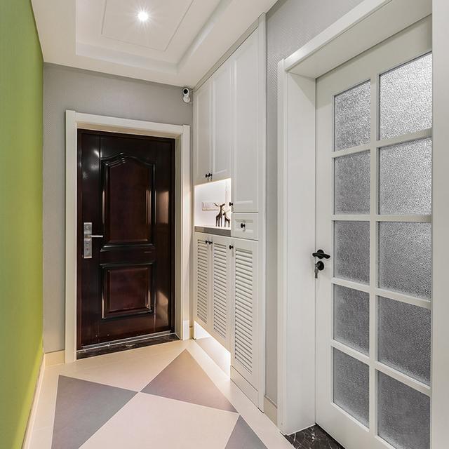 玄关的空间比较修长,为了更合理的进行空间利用,打造一个比较敞亮的玄关走廊。选择的是入墙式大柜,白色的到顶设计的储物柜,也可以说是玄关鞋柜,可以满足更多鞋子和其他物品的收纳。绿色的墙壁搭配白色的柜子,进门就能让人充满惊喜,解决收纳难题的同时,打造一个漂亮的空间环境。