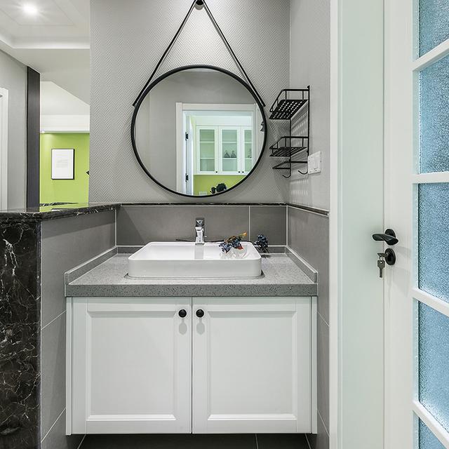 卫生间的装修采用的是一分为二的设计方式,外面敞开式的空间,安装的是壁挂式的浴柜,这种浴柜刚好可以实现收纳,转角结构砌造的是墙壁,刚好围绕着浴柜,安装浴室门做了隔断,打造了一个独立舒适的浴室空间,以后洗漱沐浴都会更方便,空间也会显得更洁净。