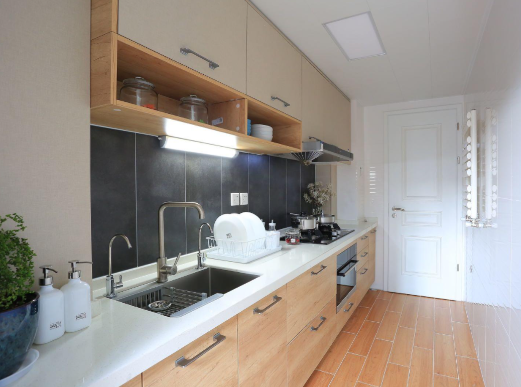 对于家里厨房的上水管,为了不影响美观可以选择埋进墙体里面或者采用走顶的方式,从而“神不知,鬼不觉”的将水管“隐藏”起来,另外,水表也不能忽视,可以将水表安装在橱柜里面。