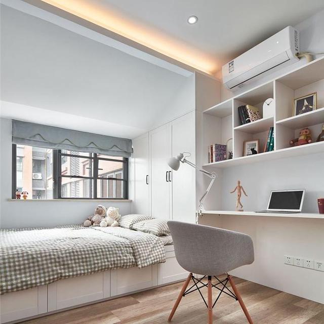次卧采用榻榻米的装修方案,这种一体化的设计能够为卧室节省不少的空间,从而让室内显得更加敞亮大气,能够让生活更加轻松。这边的书桌与衣柜采用一体化的设计,简单大方,还采用壁挂的安装方式,多层的隔板上还能摆放一些精美的壁画和装饰品,能够让卧室显得更加丰富多彩。