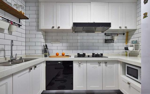 厨房设计的非常时尚大气,室内墙壁上白色的文化砖装饰,搭配白色的橱柜和吊柜,能够将厨房的空间非常好的使用了起来,丰富的储物空间能够将零散的厨具整齐的收纳起来,让厨房显得更加整齐有序。橱柜呈U型摆放安装,极大地拓宽了操作台的面积,日常做饭更加轻松。