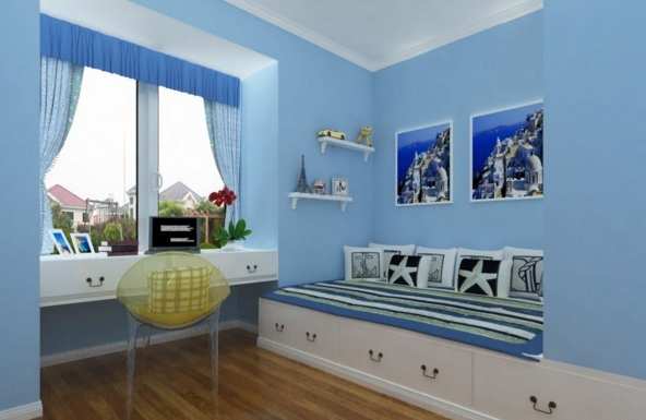 如果你是不易入眠的人,卧室应在色彩上强调宁静和温馨的色调,有利于营造良好的休息气氛,建议选择蓝色调系列、粉色和米色调系列。清浅的蓝仿佛要隐入墙面一般,搭配室内布艺软装,想要的宁静自然感就这么流露出来了。墙面以浅蓝色和白色为主基调,会令房间更加清新自然,由于冷色调具有缩小的视觉效果,使房间显得更加宽敞。