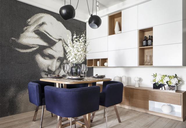 浅色的实木餐桌非常精致宽敞,搭配几把深蓝色的布艺沙发,能够轻松容纳一家人吃饭用餐,在餐桌上还能摆放一些绿植和鲜花点缀,能够为餐厅增添更多的清新与活力。在餐厅背景墙上采用打柜的方式,白色的吊柜非常精致宽敞,在隔板上还能摆放一些装饰品,周围的柜子也能轻松收纳一些小件物品,让餐厅显得更加整齐大方。
