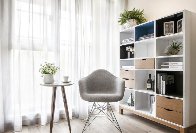 把卧室阳台改造成一间休息区,摆放了一张精致的小茶几,搭配一把舒适的椅子,闲暇的时候可以晒晒太阳喝杯咖啡,能够让人感觉更加惬意舒适。靠墙还摆放了一个简易的隔板柜,能够摆放很多书籍与装饰品,大大提升了室内的档次感与格调感。