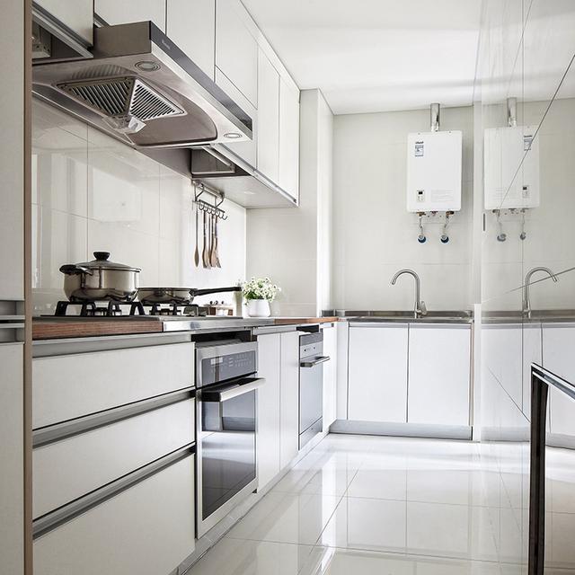 厨房的面积小,这样装修显得非常精致紧凑,室内墙壁上采用了这种灰白色的瓷砖装饰,与白色的橱柜和吊柜很好的搭配在了一起,显得质感十足。橱柜呈L型摆放安装,将厨房的空间非常好的使用了起来,最大程度的拓宽了操作台的面积,日常做饭更加轻松。丰富的储物格设计能够将零散的厨具整齐的收纳起来,日常做饭拿取也更加便利。