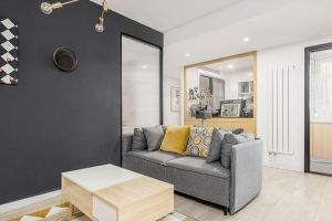 闺蜜家55平米的小户型,设计的非常新颖独特,真是让人大开眼界,能够让生活更加轻松有情调。在沙发背景墙上采用了时下非常流行的高级灰色,还装饰了一幅精美的几何图案壁画装饰,让客厅显得非常文艺有格调感。效果图