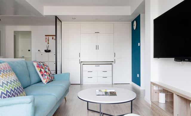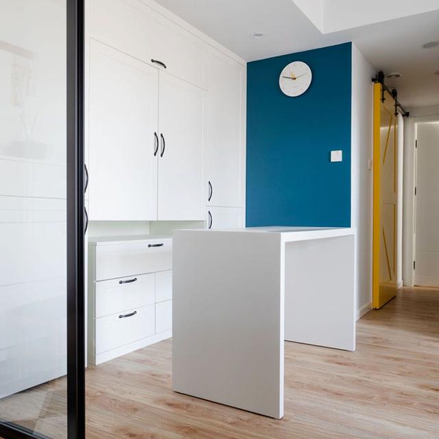 在客厅可以偷一些空间,安装了一个白色的桌子,桌子非常精致宽敞,与蓝色的背景墙很好的搭配在了一起,当做书房使用非常轻松舒适。在书房与玄关还安装了玻璃墙做为隔断,既不影响室内的空间感,同时也能让室内显得更加安静。