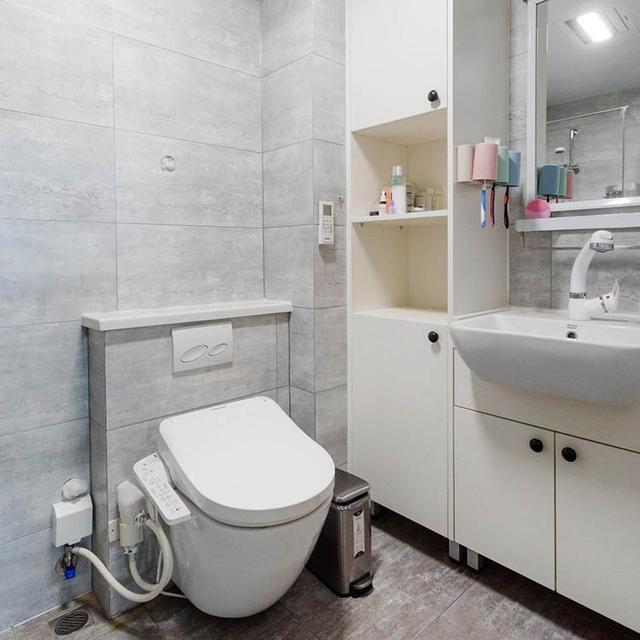 卫生间墙壁上采用了高级灰色的瓷砖装饰,能够让卫生间显得非常沉稳有档次感,同时也能起到非常好的防水效果,日常打理起来非常便利。让师傅在卫生间量身打柜,简单大方,同时也将空间非常好的使用了起来,能够将洗浴用品整齐的收纳起来,日常拿取使用更加便利。