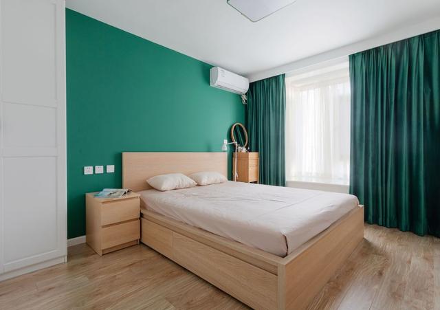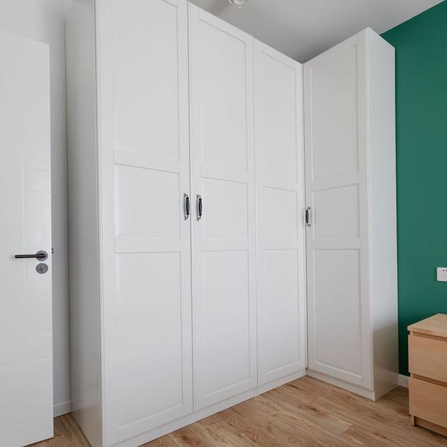 在卧室使用了这种成品衣柜,衣柜的尺寸刚刚好,呈L型摆放安装,与绿色的背景墙形成了鲜明的对比,使得卧室显得非常清爽有质感,同时也能将卧室的物品整齐的收纳起来,日常拿取使用也更加便利。