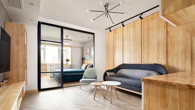 请师傅把卧室与客厅之间的墙壁砸掉,改用这种玻璃推拉门隔开,这样既不影响室内的空间,同时也能起到很好的隔断作用,能够让室内显得更加安静一些。在沙发背景墙上安装了浅色的实木扣板装饰,与周围白色的墙壁非常好的搭配在了一起,从而让客厅显得非常时尚有质感。