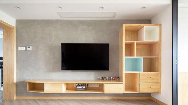 电视背景墙上采用了高级灰色的瓷砖装饰,浅色的实木电视柜非常精致,采用壁挂的安装方式,既能摆放一些装饰品,同时也能轻松收纳一些小件物品,能够让客厅显得更加时尚有立体感,让生活更加轻松有情调。