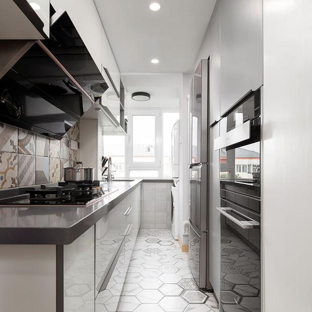 厨房的面积不大,这样装修显得非常精致紧凑,属于经典的装修方案,非常值得借鉴学习,白色的橱柜根据户型量身打造,呈L型摆放安装,还安装了一组精致的吊柜,能够将厨房的空间非常好的使用起来,能够在有限的空间里提供非常棒的储物能力,将零散的厨具整齐的收纳起来。
