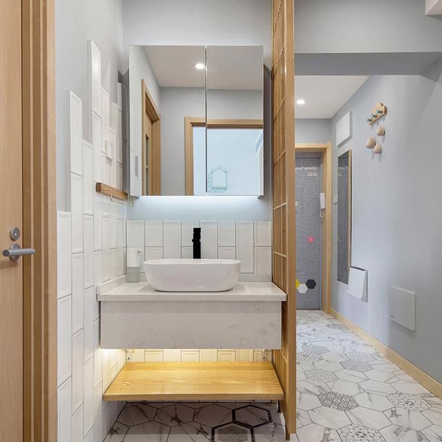 浴室柜放在了卫生间外面,日常使用起来更加顺手,白色的浴室柜非常精致,采用壁挂的安装方式,周围还采用白色的文化砖装饰,与高级灰色的背景墙很好的搭配在了一起,既能起到防水效果,也显得非常时尚有层次感。在浴室柜还安装了这种镂空的隔断装饰,既美观又大大提升了室内的档次感。
