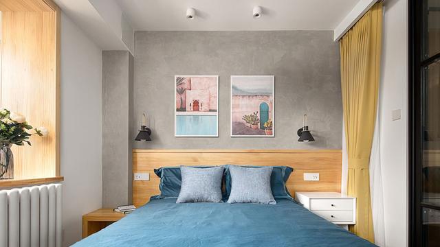 卧室床头背景墙上采用了高级灰色的格调,与周围白色的墙壁非常好的搭配在了一起,使得卧室显得层次感十足,在床头还安装了浅色的实木扣板装饰,还装饰了一组精美的壁画装饰,能够让卧室显得文艺感十足。