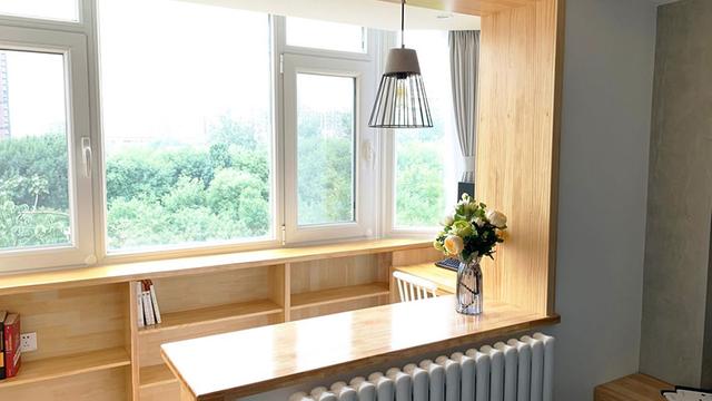 把卧室阳台改造成一间小书房,在阳台与卧室之间还安装了一个书桌作为隔断,既能办公又能起到隔断的作用。在靠窗的位置还安装了精美的隔板柜,浅色的实木隔板柜非常精致小巧,既能摆放一些书籍与装饰品,同时也没有占用太多的空间,能够让室内显得更加文艺多彩,无聊的时候还能透过窗户看到外面美丽的景色,能够让人得到非常好的放松。