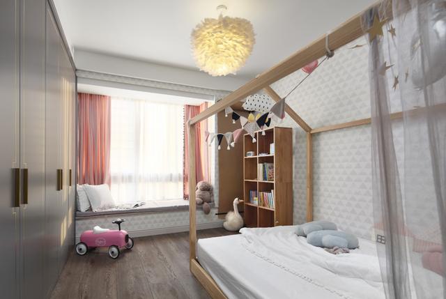 儿童房墙壁上采用这种带有花纹的壁布装饰,搭配浅色的实木地板装饰,使得卧室显得非常温馨有质感。卧室的衣柜非常精致,采用入墙式的安装方式,既不影响室内的空间感,同时也能将室内的物品整齐的收纳起来,让儿童房显得更加敞亮,为孩子打造一个轻松舒适的休息环境。