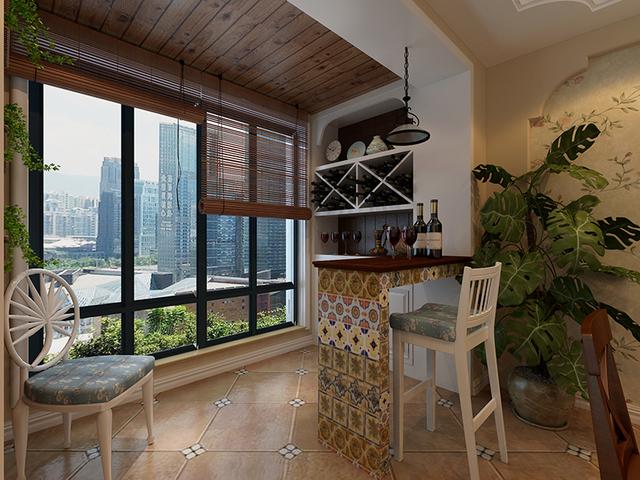阳台与客厅之间打造了一个精美的吧台,吧台上采用这种带有花纹的瓷砖装饰,使得室内显得档次感十足,在阳台上还安装了精致的酒柜,能够将红酒整齐的收纳起来,使得阳台显得非常整齐大方,本身也是一道亮丽的风景线,周末的时候可以和自己的爱人来杯红酒,欣赏一下窗外的景色,为生活增添更多的清新与活力。