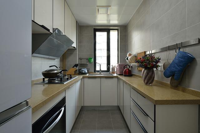 厨房的面积比较小,这样装修显得非常精致紧凑,厨房墙壁上采用了高级灰色的大理石瓷砖装饰,与白色的橱柜非常好的搭配在了一起,能够让厨房显得非常文艺有层次感。橱柜呈U型摆放安装,搭配一组吊柜,能够将厨房的空间非常好的使用了起来,这样安装橱柜,也能最大程度的拓宽了操作台的面积,日常做饭更加轻松,橱柜和吊柜有着丰富的储物空间,能够将零散的厨具整齐的收纳起来,让室内显得更加整齐有序。