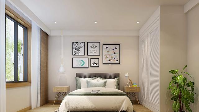 卧室墙壁上采用了浅咖色的格调,搭配浅色的实木地板装饰,能够让卧室显得非常温馨舒适,在床头背景墙上还装饰了一组精美的壁画,简单的装饰能够为卧室增添更多的清新与活力。卧室的衣柜非常精致,采用入墙式的安装方式,简单大方,能够将卧室的物品整齐的收纳起来,从而让人得到非常好的休息。