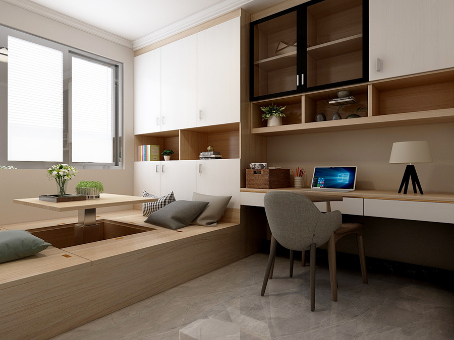 将榻榻米于衣柜、书柜、书桌椅一体化设计,大容量收纳的同时,又十分具有墙面装饰效果。