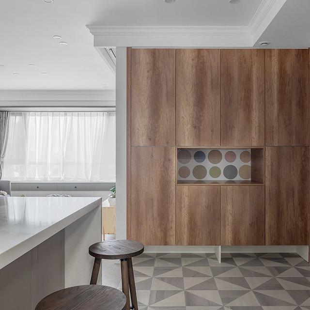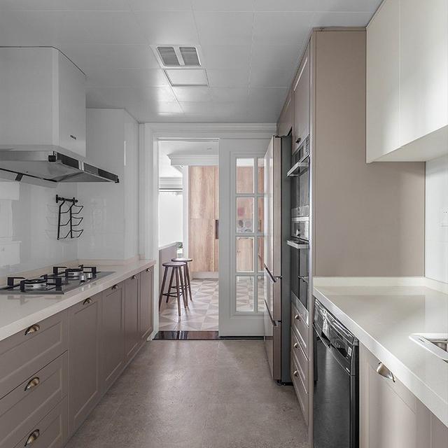 厨房装修的非常精致有档次感,原木色的橱柜非常精致,呈U型摆放安装,将厨房的空间非常好的使用了起来,最大程度的拓宽了操作台的面积,日常做饭更加轻松。搭配一组吊柜,能够在有限的空间里提供非常好的储物空间,将厨具整齐的收纳起来,日常做饭拿取使用也更加便利。