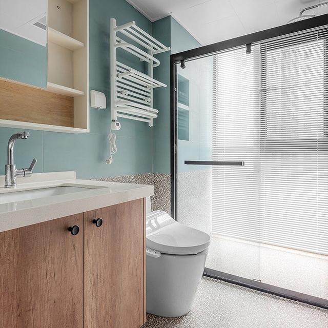 卫生间墙壁上采用了淡青色的防水漆面,下半部分采用高级灰色的大理石瓷砖装饰,让卫生间显得非常时尚有层次感,能够起到很好的防水防潮效果,日常打理起来也更加便利。在卫生间巧做干湿分离,利用玻璃推拉门将淋浴隔在靠窗的位置,在墙壁上还打洞,可以将洗浴用品很好的收纳起来,日常洗澡更加便利。
