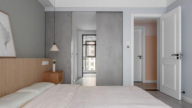 主卧墙壁上采用了高级灰色的格调,搭配浅色的实木地板装饰,能够让卧室显得非常时尚大气,浅色的实木大床非常精致宽敞,搭配舒适的被褥,能够营造出一种温馨舒适的休息环境。