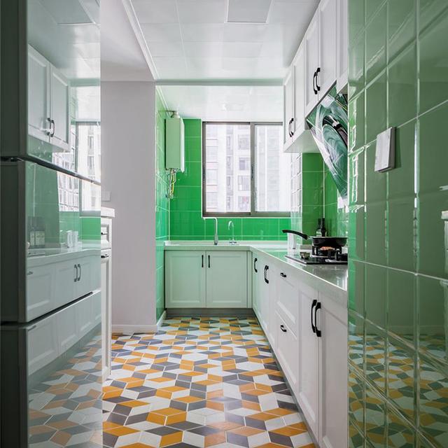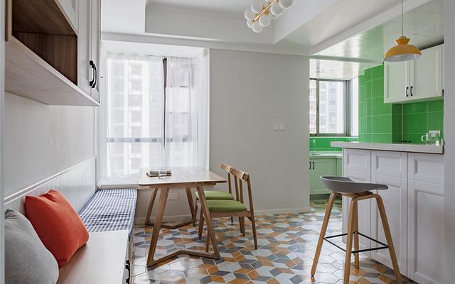 厨房采用开放式的设计,这样能够让室内显得更加敞亮大气,从而让生活更加轻松舒适,厨房墙壁上采用了浅绿色的瓷砖装饰,与白色的橱柜非常好的搭配在了一起,使得厨房显得更加清新自然,橱柜呈L型摆放安装,同时也能提供非常好的储物空间,能够将厨具整齐的收纳起来,日常做饭拿取使用也更加便利。厨房与客厅之间还安装了一个简易的吧台,简单大方,搭配两把舒适的椅子,做为临时的餐厅使用也是非常不错的。