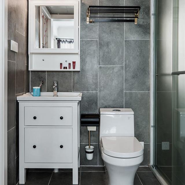 卫生间这样装修显得非常精致紧凑,在卫生间墙壁上还采用了高级灰色的大理石瓷砖装饰,搭配白色的缝线,能够让室内显得更加时尚有线条感,同时也能起到很好的防潮效果,日常打理起来也更加便利。卫生间巧做干湿分离,利用玻璃推拉门将淋浴隔在靠窗的位置,简单大方,能够起到很好的干湿分离效果,日常洗澡也更加便利。