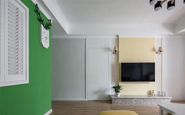客厅电视背景墙上采用高级灰色的格调,在背景墙上还采用了白色的扣板装饰,能够大大提升客厅的档次感与格调感,在背景墙上还设计了精美的造型,将电视很好的固定在墙壁上,在背景墙的两边各安装了一盏壁挂灯,柔和的灯光能够让客厅显得更加温馨有立体感。在沙发背景墙上还采用了绿色的格调,还安装了一个精美的镜子,卡通图案的设计,能够让客厅显得更加可爱有活力。