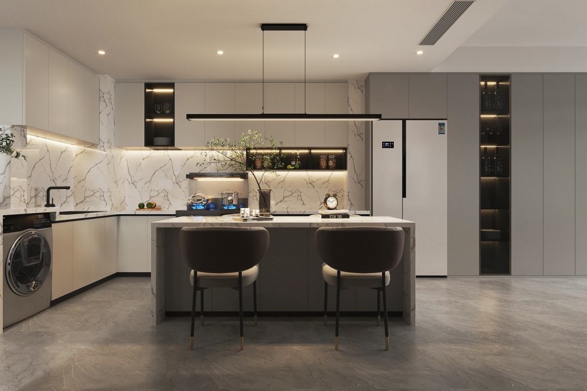 如果是开放式厨房,将料理台延伸出来做成小餐台也是不错的构思,这样不仅能将餐厅与厨房合二为一,达到延展空间的效果,形成了一个温馨而实用的用餐区域,而且餐台上可以装置灯光,增添装饰效果。