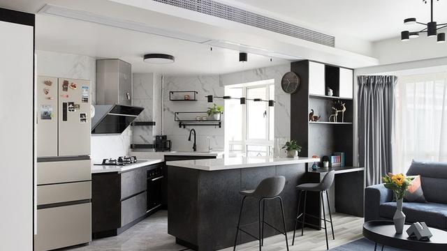 厨房采用开放式的设计,这样能够让室内显得更加敞亮大气,既美观又能让室内显得更加敞亮大气,让生活更加轻松舒适。高级灰色的橱柜呈U型摆放安装,搭配浅灰色的大理石台面,既美观日常打理起来也更加便利,搭配一组吊柜,能够在有限的空间里提供非常好的储物空间,从而将零散的厨具整齐的收纳起来,让室内显得更加整齐大方。