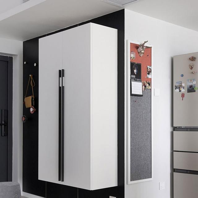 玄关设计的非常文艺时尚,玄关背景墙上采用黑色的格调,还安装了白色的玄关柜,柜子采用壁挂的安装方式,既美观又能起到很好的储物空间,能够将玄关的物品整齐的收纳起来,日常出门拿取使用也更加便利。