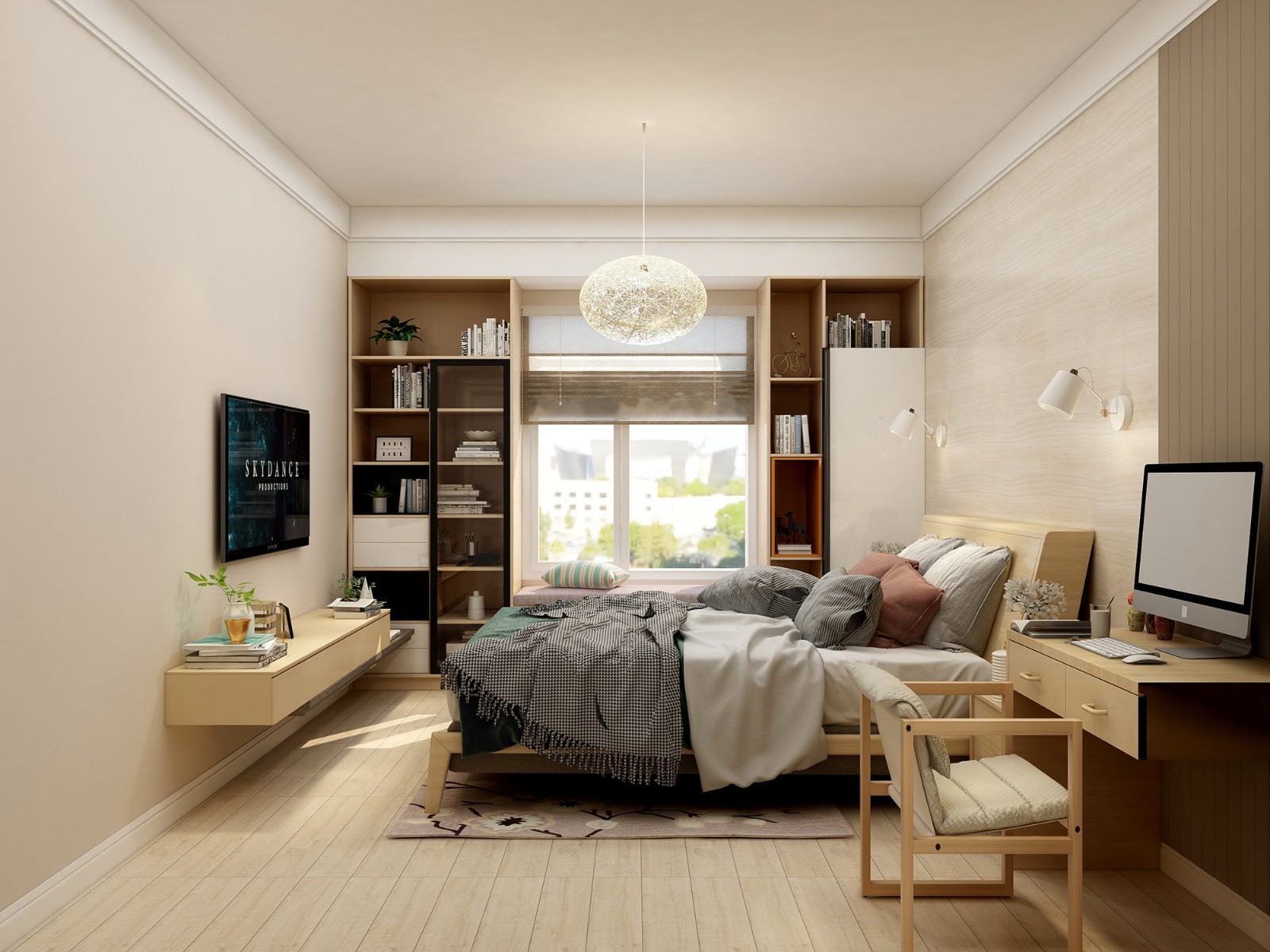 米白色空间中,与原木系家具搭配,各种小饰品、绿植的点缀,诉说着卧室空间的宁静淡然。