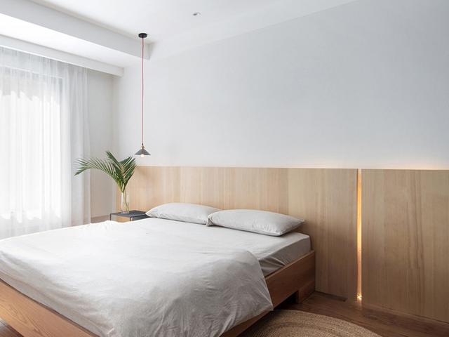 主卧墙壁直接刷成了白色的格调,在床头还采用浅色的实木扣板装饰,能够让室内显得更加时尚有层次感。卧室的大床简单大方,搭配舒适的被褥,能够营造出一种十分温馨舒适的休息环境,在床头还摆放了一盆高大的绿植,能够为室内增添更多的清新与活力。